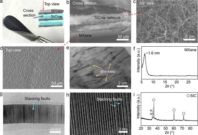 圖2 a) MXene/SiCnw膜的數(shù)碼照片和模型;b) 具有層狀雙電容器結(jié)構(gòu)的MXene/SiCnw膜的橫截面SEM圖像;c) SiCnw三維網(wǎng)絡(luò)的SEM圖像;d) MXene膜的頂視圖;e) 帶有褶皺的MXene納米片的TEM圖像;f) MXene膜的XRD圖譜;g) 具有堆垛層錯(cuò)的SiCnw的TEM圖像;h) SiCnw的高分辨率TEM圖像;i) SiCnw網(wǎng)絡(luò)的XRD圖譜