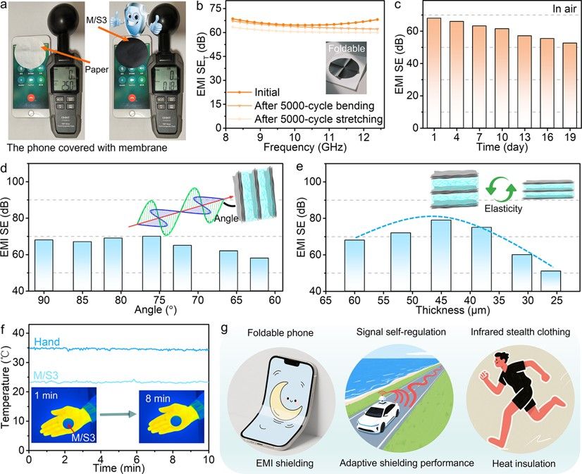 圖5 a) M/S3膜的屏蔽應(yīng)用;b) M/S3膜拉伸彎曲后屏蔽性能的變化;c) M/S3膜隨時(shí)間的性能趨勢(shì);d) 不同角度和e) 不同壓縮厚度下M/S3膜的電磁干擾屏蔽性能;f) 隨時(shí)間變化的紅外圖像;g) M/S3膜的潛在應(yīng)用
