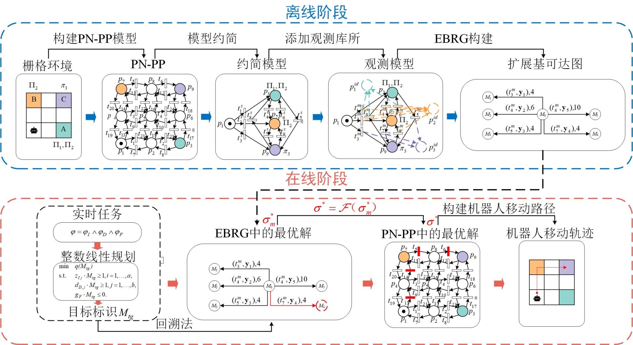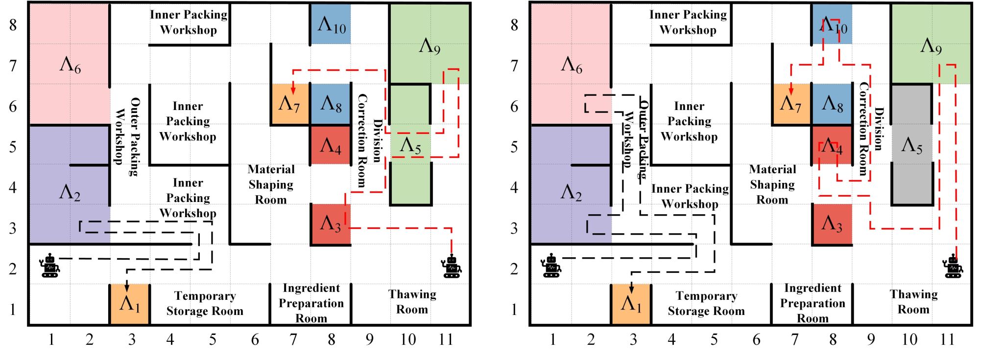 針對上述難點,本研究團(tuán)隊提出了一種基于Petri網(wǎng)的多機器人系統(tǒng)最優(yōu)路徑規(guī)劃方法。通過將多機器人系統(tǒng)抽象為圖形化的Petri網(wǎng)模型,并設(shè)計結(jié)構(gòu)控制器,實現(xiàn)復(fù)雜任務(wù)約束的形式化表征。為避免機器人數(shù)量增加而引發(fā)狀態(tài)爆炸問題,提出一種狀態(tài)空間壓縮方法和高效的實時在線規(guī)劃算法,實現(xiàn)多機器人復(fù)雜任務(wù)的實時分配和最優(yōu)路徑規(guī)劃。理論分析與數(shù)值實驗均表明,該方法在保證規(guī)劃最優(yōu)性的同時,顯著提升了計算效率和可擴展性,尤其在機器人數(shù)量和環(huán)境規(guī)模不斷增加的情況下,表現(xiàn)出優(yōu)于現(xiàn)有方法的性能。