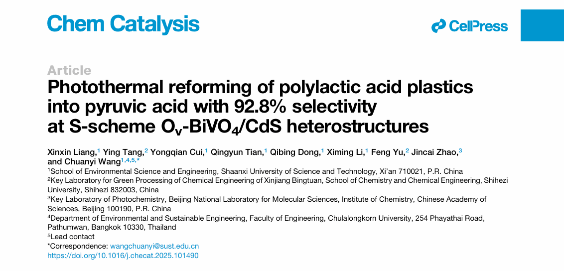 近日,我校王傳義教授團(tuán)隊在Cell Press細(xì)胞出版社旗下期刊《Chem Catalysis》上發(fā)表了題為“Photothermal reforming of polylactic acid plastics into pyruvic acid with 92.8% selectivity at S-scheme Ov-BiVO4/CdS heterostructures”的研究論文。我校王傳義教授為文章通訊作者,環(huán)境學(xué)院博士生梁芯芯為文章第一作者,陜西科技大學(xué)為唯一通訊單位。