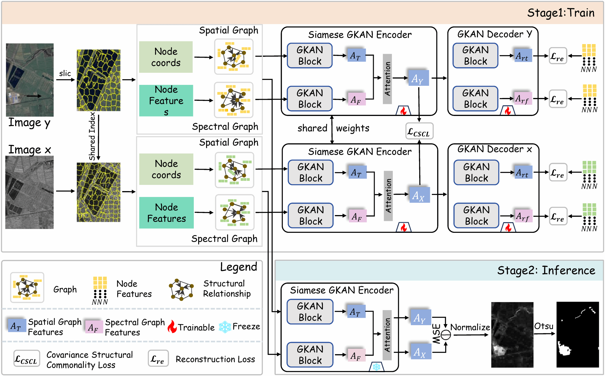 該論文由陜西科技大學(xué)和西安理工大學(xué)聯(lián)合完成,提出了一種基于雙分支圖Kolmogorov-Arnold自編碼網(wǎng)絡(luò)的無監(jiān)督多模態(tài)變化檢測方法。論文針對跨模態(tài)遙感影像分析中因傳感器成像差異導(dǎo)致的數(shù)據(jù)域偏移與特征非線性建模問題,創(chuàng)新性地設(shè)計(jì)了Graph-KAN基礎(chǔ)網(wǎng)絡(luò)挖掘跨模態(tài)遙感影像間空間結(jié)構(gòu)關(guān)系和跨模態(tài)非線性映射關(guān)系,并構(gòu)建了基于雙分支GKAN的無監(jiān)督跨模態(tài)空譜結(jié)構(gòu)共性學(xué)習(xí)框架,為無監(jiān)督跨模態(tài)變化檢測提供了新方案。
