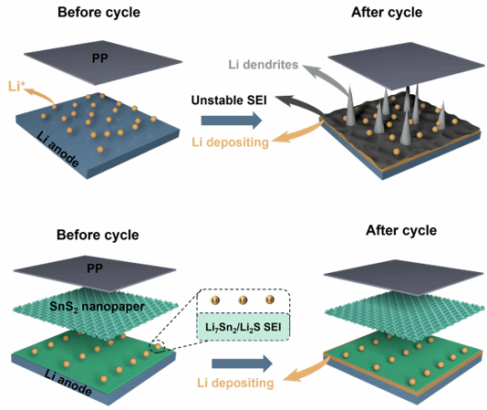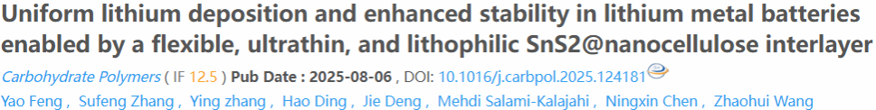 本團(tuán)隊(duì)利用納米纖維素作為一維模板,通過真空輔助自組裝技術(shù),成功制備出厚度僅約1微米的自支撐SnS2納米紙作為功能化中間層。這種創(chuàng)新的中間層具有自支撐性能和機(jī)械靈活性,同時無需降低活性的粘合劑。納米纖維素基質(zhì)的均勻介孔結(jié)構(gòu)保證了均勻的鋰離子通量,增強(qiáng)了電化學(xué)穩(wěn)定性。在該框架內(nèi),SnS2能與鋰金屬自發(fā)反應(yīng),在原位形成富含高離子電導(dǎo)率Li2S和Li7Sn2的穩(wěn)定SEI層。采用該中間層的對稱電池在1 mA cm-2的電流密度下能夠穩(wěn)定循環(huán)超過1400 h。相關(guān)研究成果以 “Uniform lithium deposition and enhanced stability in lithium metal batteries enabled by a flexible, ultrathin, and lithophilic SnS2@nanocellulose interlayer (文章鏈接:https://doi.org/10.1016/j.carbpol.2025.124181)。