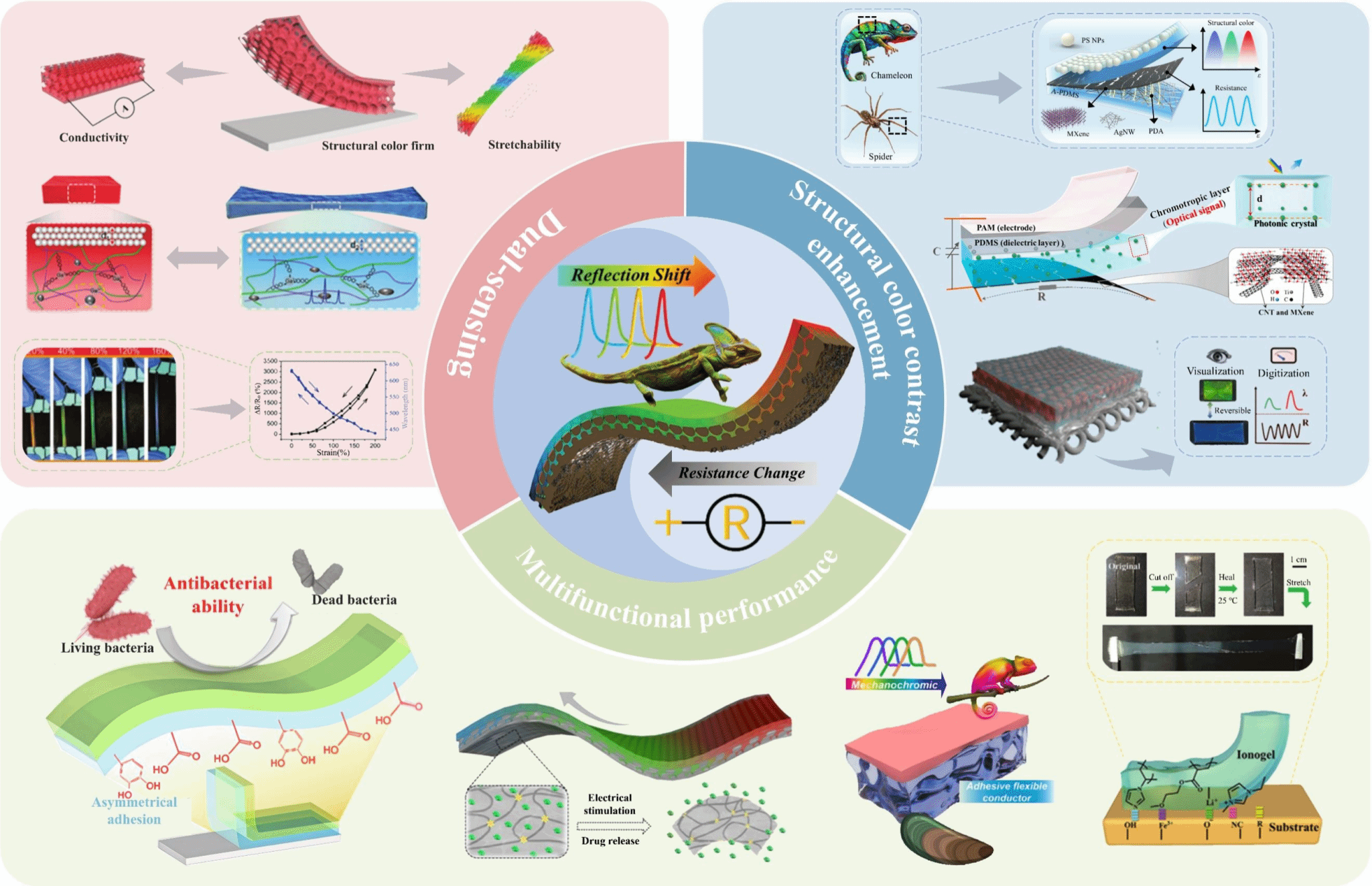 基于在柔性電子與新型傳感技術(shù)方面的研究積累,研究團隊綜述了具有仿生微結(jié)構(gòu)的柔性觸覺傳感器的前沿進展,重點關(guān)注了集成電-光雙信號輸出的新型設(shè)計。文章系統(tǒng)闡述了該類傳感器的協(xié)同設(shè)計機制、性能優(yōu)化策略及其在電子皮膚、健康監(jiān)測等領(lǐng)域的應(yīng)用前景與挑戰(zhàn),為多模態(tài)柔性感知系統(tǒng)的發(fā)展提供了理論參考。