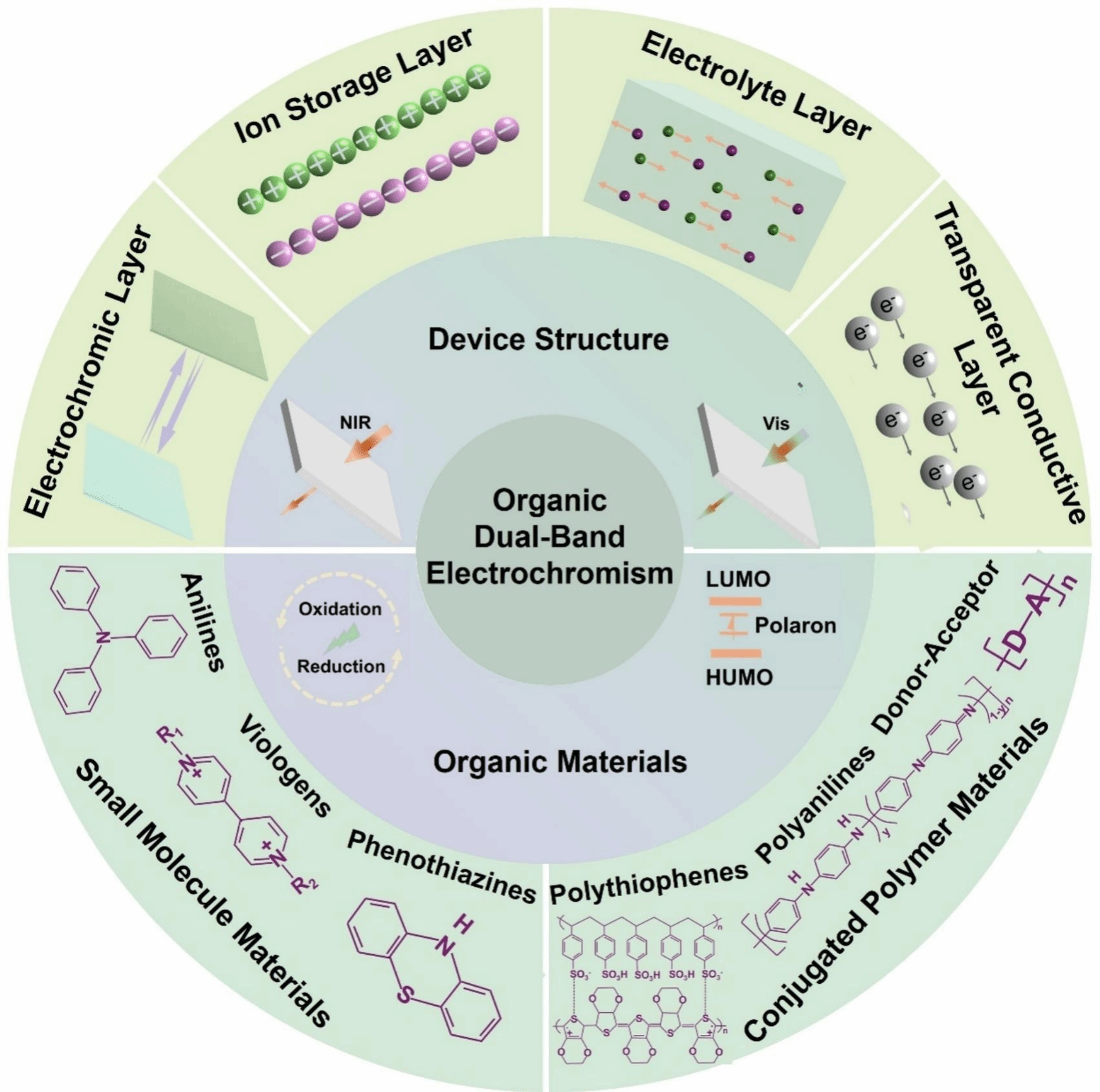 基于團隊在光調(diào)制與智能顯示領(lǐng)域的長期研究基礎(chǔ),本綜述系統(tǒng)梳理了有機雙波段電致變色方向的最新進展。文章重點闡述了該類材料與器件的工作機制、設(shè)計策略(涵蓋小分子與聚合物體系)及性能優(yōu)化路徑,總結(jié)了當(dāng)前面臨的關(guān)鍵挑戰(zhàn),并對未來發(fā)展趨向作出展望。該工作為設(shè)計開發(fā)高性能雙波段電致變色材料與器件提供了堅實的理論支撐。