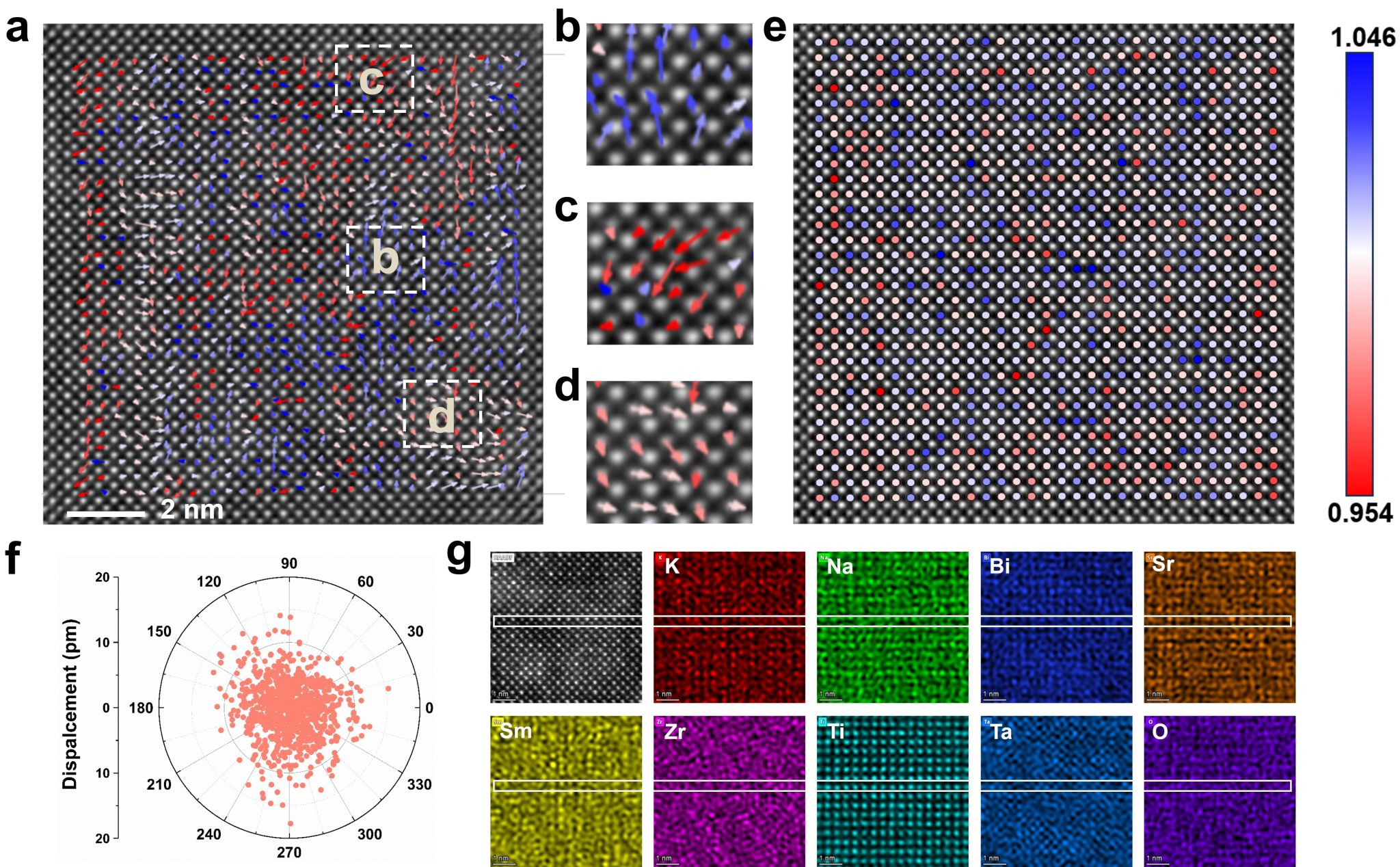 突破傳統(tǒng)鐵電材料儲能限制必須實現(xiàn)兼具高擊穿強度和低滯后損耗的類線性極化行為。針對這一問題,陜西科技大學楊海波教授團隊提出通過熵工程來誘導原子級多態(tài)極化漲落,促進原子尺度的晶格紊亂,誘導出R、T共存的原子級多態(tài)極化漲落,減弱極化各向異性和疇切換勢壘,實現(xiàn)具有低滯后的類線性極化行為。結(jié)合器件原型制備,2.0R高熵MLCC在1045 kV·cm-1高電場下實現(xiàn)了21.3 J·cm-3的超高可恢復(fù)能量密度,同時儲能效率高達94.5%。得益于這種結(jié)構(gòu)優(yōu)勢,該MLCC原型器件還具有出色的寬溫、頻率和循環(huán)穩(wěn)定性,充分展示了其在介電儲能領(lǐng)域的應(yīng)用潛力。研究通過原子分辨率的STEM表征證實,2.0R陶瓷中的原子級多態(tài)極化漲落結(jié)構(gòu)由若干極化離子組成,無明確疇界,這種結(jié)構(gòu)可在寬溫度范圍內(nèi)維持穩(wěn)定的短程漲落,顯著提升了材料的寬溫穩(wěn)定性。該工作揭示的熵-結(jié)構(gòu)-性能關(guān)聯(lián)為高性能介電電容器的設(shè)計提供了新理論框架和技術(shù)路徑,通過熵工程調(diào)控原子級多態(tài)極化漲落的策略有望為高性能MLCC的開發(fā)提供通用途徑。