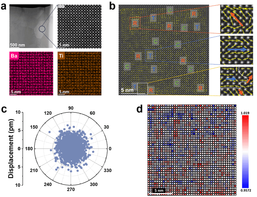 為突破上述瓶頸,研究者們嘗試通過(guò)構(gòu)建納米疇結(jié)構(gòu)、優(yōu)化化學(xué)組成、設(shè)計(jì)核殼結(jié)構(gòu)、調(diào)控電場(chǎng)均一性等手段提升儲(chǔ)能性能。然而,這些方法在提升最大極化(Pmax)與擊穿場(chǎng)強(qiáng)(Eb)的同時(shí),往往難以兼顧低剩余極化(Pr)與高儲(chǔ)能效率(η),且熱穩(wěn)定性仍不理想。針對(duì)上述問(wèn)題,陜西科技大學(xué)材料科學(xué)與工程學(xué)院楊海波教授團(tuán)隊(duì)以BaTiO3為基體,采用相場(chǎng)模擬指導(dǎo)高熵設(shè)計(jì)策略,選取Na+、Sr2+、Ca2+、Bi3+作為A位摻雜離子,選取Zn2+、Zr4+、Ta5+、Nb5+作為B位摻雜離子。通過(guò)固相燒結(jié)工藝,最終制備出具有梯度構(gòu)型熵的BaTiO3基高熵陶瓷體系,如圖1所示。利用原子級(jí)高角環(huán)形暗場(chǎng)掃描透射電子顯微鏡(HAADF-STEM)進(jìn)行表征,結(jié)果發(fā)現(xiàn)A/B位多元素共占位現(xiàn)象誘導(dǎo)產(chǎn)生了顯著的晶格畸變,有效促成了T-R-C多相共存的局域極化構(gòu)型,如圖2所示。而這種特殊的微觀結(jié)構(gòu)能夠有效降低材料的極化各向異性與電疇翻轉(zhuǎn)勢(shì)壘,為后續(xù)儲(chǔ)能性能的優(yōu)化奠定了關(guān)鍵的結(jié)構(gòu)基礎(chǔ)。在此基礎(chǔ)上,研究團(tuán)隊(duì)利用構(gòu)型熵值為2.13R的高熵陶瓷粉體制備出具有優(yōu)良的燒結(jié)質(zhì)量和微觀結(jié)構(gòu)的MLCCs原型器件。在1065 kV·cm-1的高電場(chǎng)強(qiáng)度下,2.13R-MLCCs展現(xiàn)出了優(yōu)異的綜合儲(chǔ)能性能(Wrec ~ 17.2 J·cm-3,η ~ 95.5%),且在寬溫區(qū)與長(zhǎng)循環(huán)條件下性能穩(wěn)定,如圖3所示。該研究系統(tǒng)揭示了構(gòu)型熵與極化構(gòu)型、儲(chǔ)能性能之間的內(nèi)在聯(lián)系,為高性能MLCCs的設(shè)計(jì)與產(chǎn)業(yè)化提供了新思路和技術(shù)路徑。
