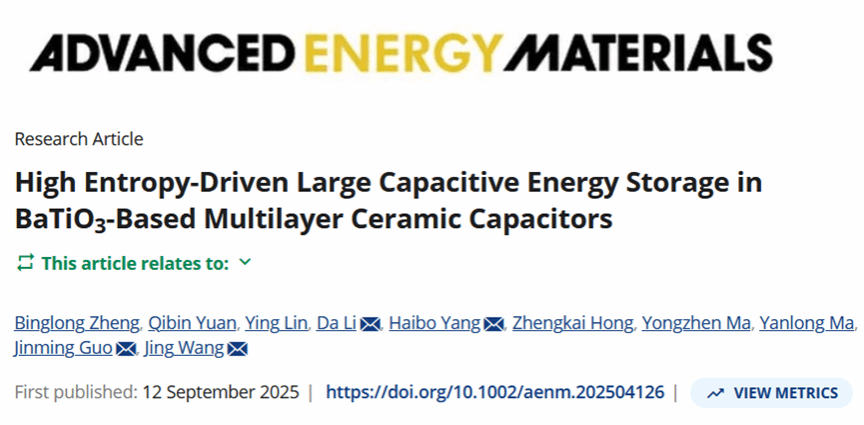 近日,材料科學(xué)與工程學(xué)院楊海波教授團(tuán)隊(duì),在國(guó)際頂級(jí)期刊《Advanced Energy Materials》(IF:26)上發(fā)表了題為“High Entropy-Driven Large Capacitive Energy Storage in BaTiO3-Based Multilayer Ceramic Capacitors”的研究論文,并被選為當(dāng)期Front Cover(前封面)。我校李達(dá)博士后,楊海波教授,湖北大學(xué)郭金明教授和南京航空航天大學(xué)王婧教授為共同通訊作者,陜西科技大學(xué)材料學(xué)院博士生鄭秉龍,電智學(xué)院袁啟斌副教授和材料學(xué)院林營(yíng)教授為共同第一作者,陜西科技大學(xué)為第一通訊單位。
