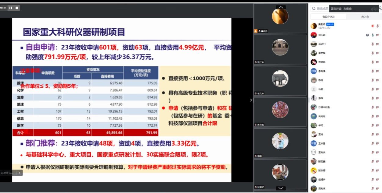 隨后,劉伍明研究員介紹了2025年國家自然科學基金項目資助體系、評審政策及申報書內(nèi)容撰寫的注意事項。針對如何精準凝練研究目標、科學問題,如何合理設(shè)計研究方案和技術(shù)路線,如何清晰展示預(yù)期成果和對社會的潛在貢獻做了詳細簡介。并就教師申報過程中關(guān)注的問題做了充分交流。