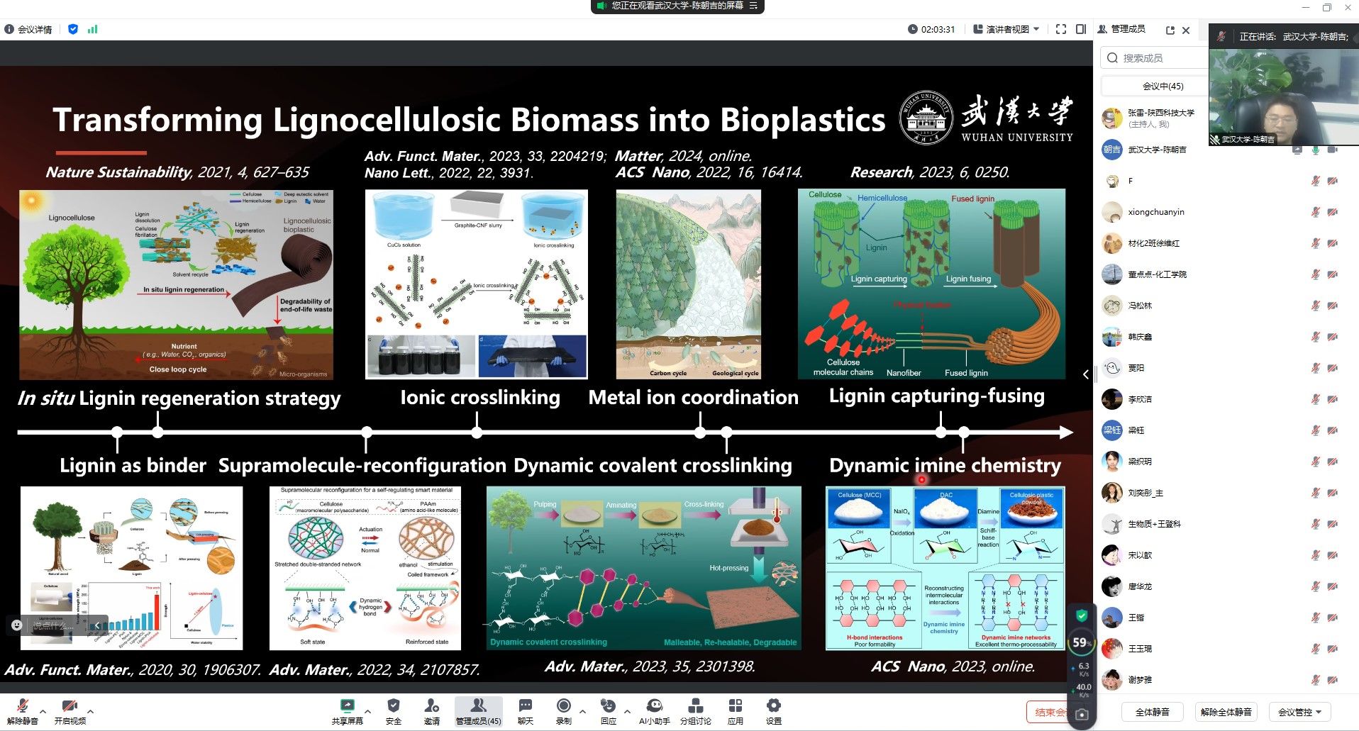 為促進優(yōu)秀科研成果的交流,拓寬學生的學術視野,創(chuàng)造學術交流新機會,應我校輕工科學與工程學院(柔性電子學院)、科技處及前沿院邀請,12月13日,武漢大學陳朝吉教授做客我?!扒把乜茖W報告”,并以做了題為“木質生物質基低碳功能材料”線上報告。報告會由輕工學院張雷副教授主持,學院相關師生參加了此次報告會。