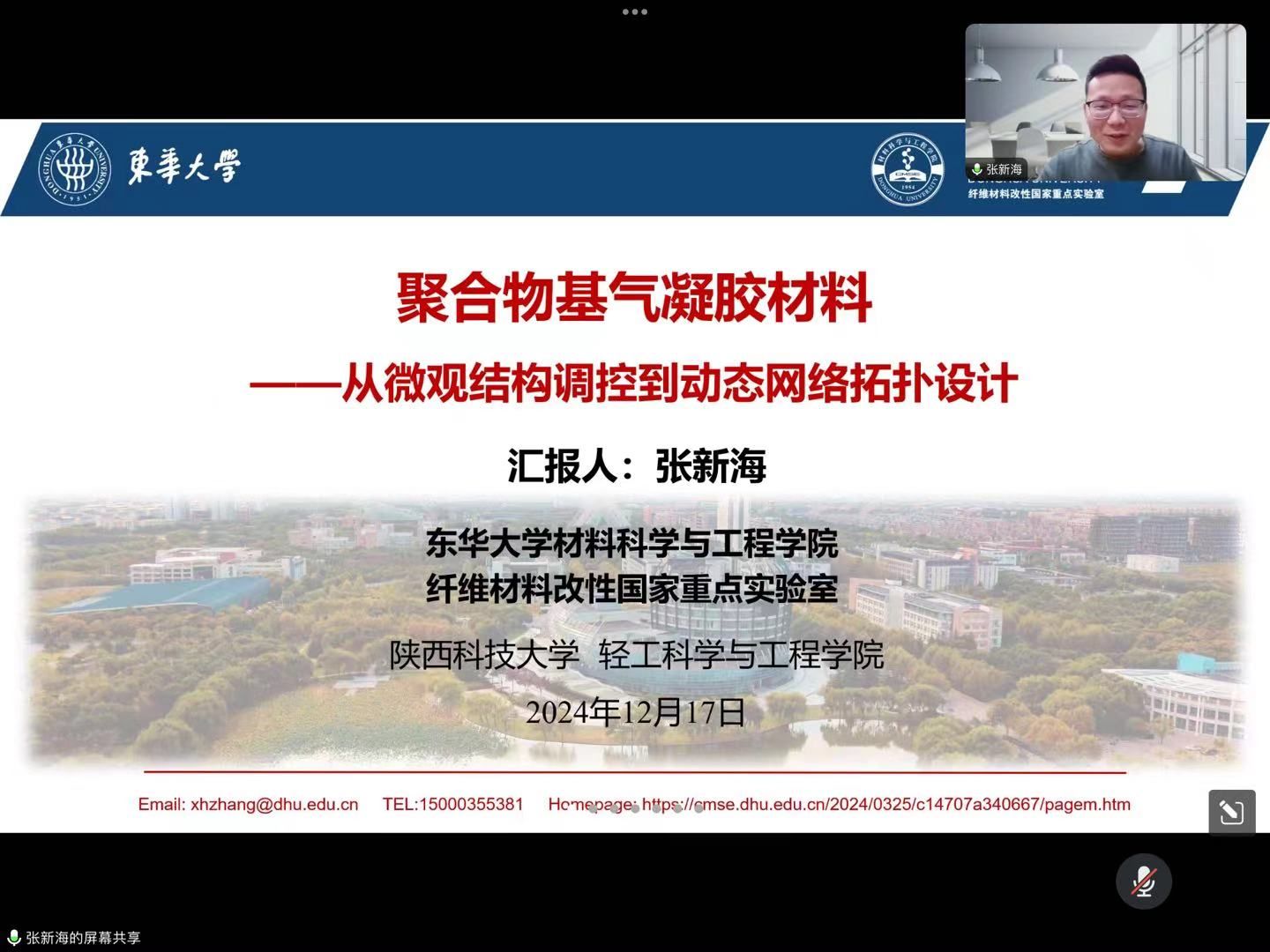 12月17日,應(yīng)輕工科學(xué)與工程學(xué)院(柔性電子學(xué)院)和研究生院邀請(qǐng),東華大學(xué)纖維材料改性國(guó)家重點(diǎn)實(shí)驗(yàn)室副研究員張新海做客我?!拔囱雽?dǎo)師論壇”,作了題為“聚合物基氣凝膠材料—從微觀結(jié)構(gòu)調(diào)控到動(dòng)態(tài)網(wǎng)絡(luò)拓?fù)湓O(shè)計(jì)”的線上學(xué)術(shù)報(bào)告,輕工學(xué)院相關(guān)專業(yè)教師、研究生及本科生參加了本次報(bào)告會(huì)。