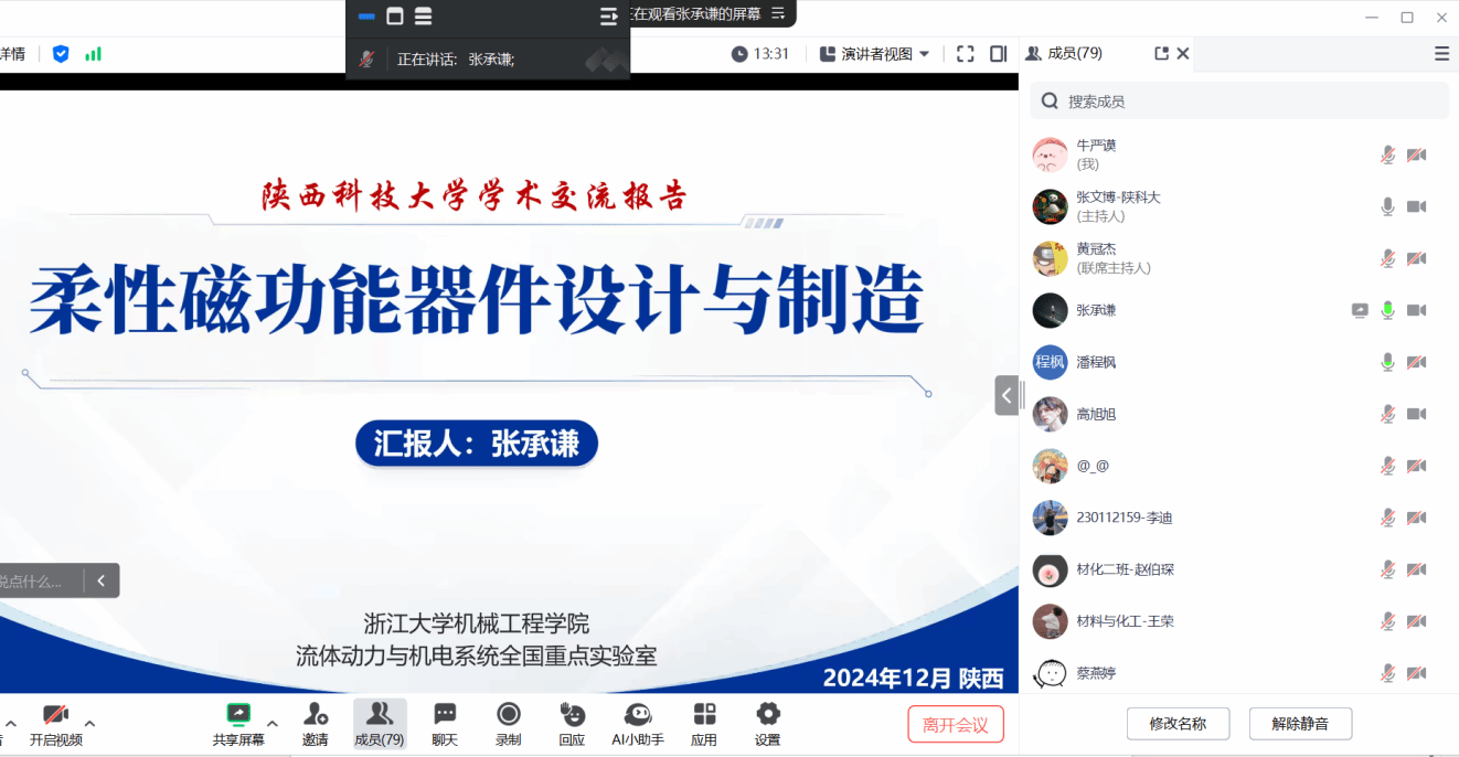 12月18日下午,應(yīng)輕工科學(xué)與工程學(xué)院(柔性電子學(xué)院)和研究生院邀請,浙江大學(xué)張承謙副研究員做客我校 “未央導(dǎo)師論壇”,作了題為 “柔性磁功能器件設(shè)計與制造”的線上學(xué)術(shù)報告。輕工學(xué)院相關(guān)專業(yè)教師、研究生及本科生參加了本次報告會。
