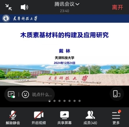12月26日,應(yīng)輕工科學(xué)與工程學(xué)院(柔性電子學(xué)院)和科技處、前沿院邀請,天津科技大學(xué)戴林教授做客我?!扒把乜茖W(xué)報告”,并作了題為“木質(zhì)素基材料的構(gòu)建及應(yīng)用研究”的線上學(xué)術(shù)報告。本次前沿科學(xué)報告由輕工學(xué)院黨旭崗副教授主持,學(xué)院相關(guān)教師和全體研究生參加了本次報告會。