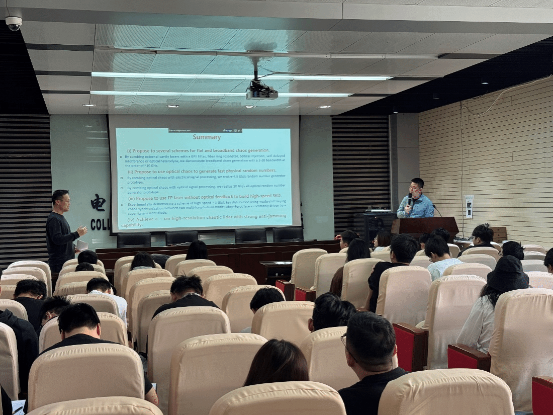 報告結(jié)束后,李璞教授與現(xiàn)場參會的師生們圍繞混沌光學(xué)及相關(guān)領(lǐng)域的專業(yè)問題展開了熱烈而深入的探討。面對師生們踴躍提出的疑問,李璞教授以極大的熱情和耐心,逐一給予了詳盡且富有啟發(fā)性的解答。此次學(xué)術(shù)分享不僅極大地拓寬了師生們的學(xué)術(shù)視野,使大家對混沌光學(xué)在現(xiàn)代科技中的重要地位有了更為深刻的認識,同時也為相關(guān)領(lǐng)域的研究工作提供了新的思路與方向,激發(fā)了師生們對科學(xué)探索的濃厚興趣。