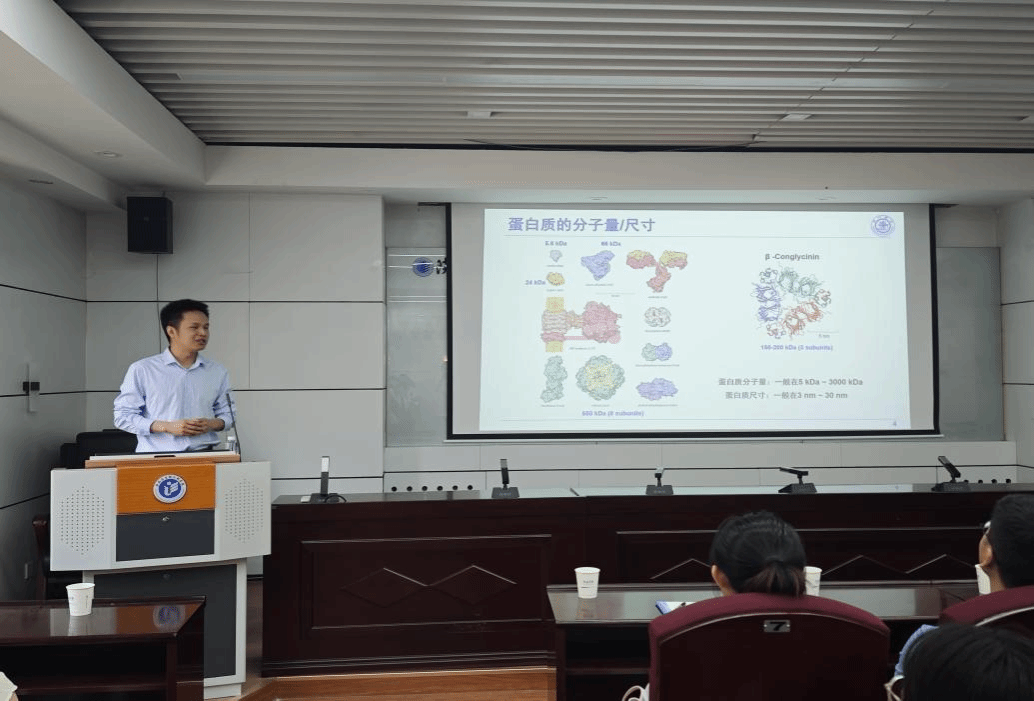 操義平教授以植物源食品蛋白質(zhì)的纖維化研究為例,從蛋白質(zhì)結(jié)構(gòu)解析與功能應(yīng)用兩方面為參會(huì)師生進(jìn)行了詳細(xì)介紹。他講解了大豆11S蛋白、花生蛋白、棉籽蛋白等植物蛋白的纖維化機(jī)制,指出通過(guò)調(diào)控溫度與時(shí)間可實(shí)現(xiàn)纖維結(jié)構(gòu)的定向設(shè)計(jì)。基于中國(guó)血紅蛋白年儲(chǔ)量超157萬(wàn)噸、全球超594萬(wàn)噸的數(shù)據(jù),他強(qiáng)調(diào)開(kāi)發(fā)新型蛋白資源對(duì)滿(mǎn)足人口蛋白需求的戰(zhàn)略意義,并在植物蛋白資源高效利用方面提出指導(dǎo)性的建議。