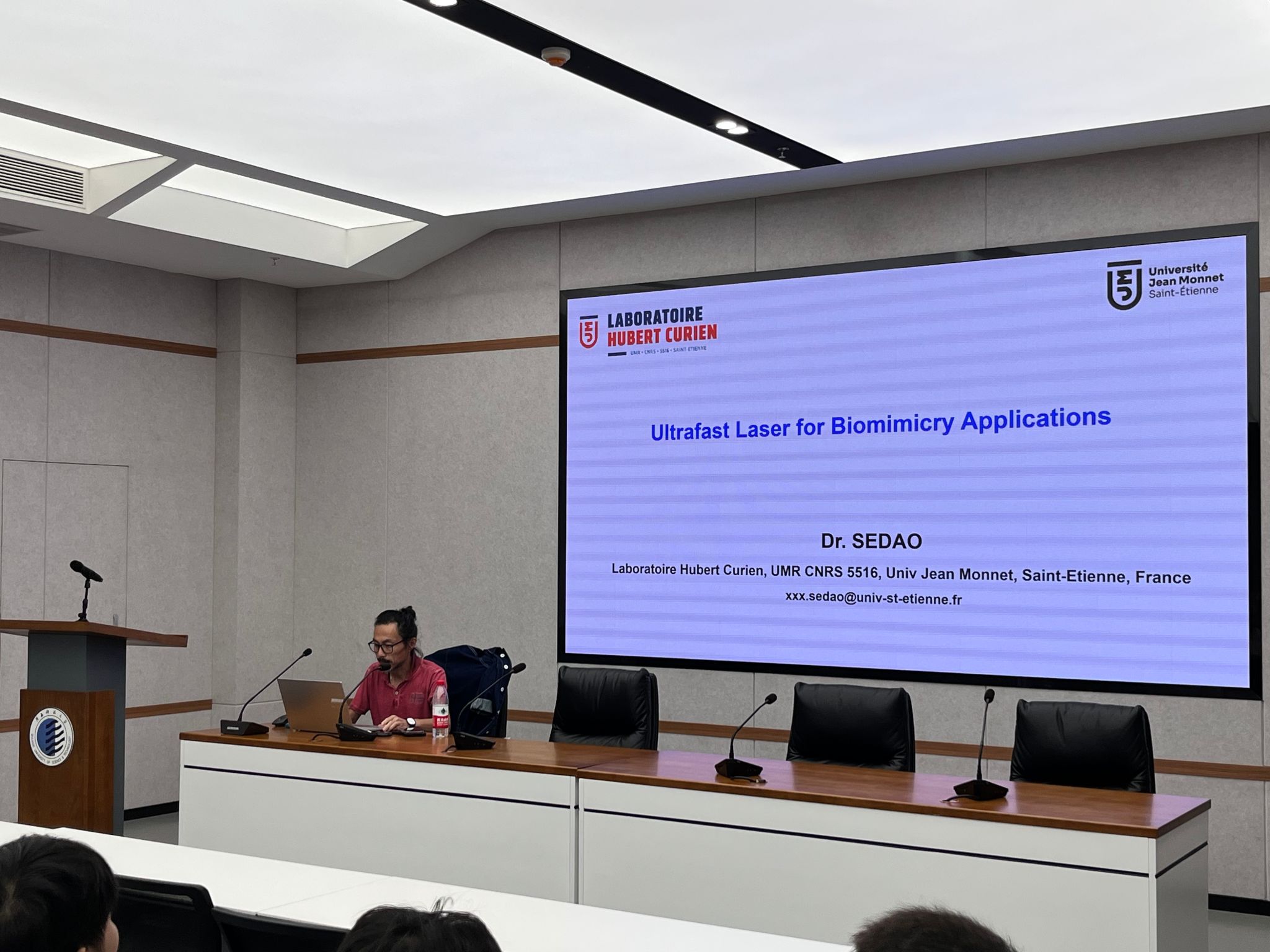 9月1日的報(bào)告中,SEDAO教授以“Ultrafast Laser Processing: Applications Overview”為題,系統(tǒng)講解了超高速激光脈沖與材料的相互作用機(jī)制、表面功能化技術(shù)及工業(yè)化應(yīng)用路線,解析了核心技術(shù)原理與落地路徑,并結(jié)合增材制造、生物醫(yī)學(xué)等實(shí)例,展現(xiàn)了超快激光的廣泛應(yīng)用潛力。3日,他以“Ultrafast Laser for Biomimicry Applications”為題,圍繞仿生學(xué)展開,闡述了仿生學(xué)理念,介紹了自然啟發(fā)表面的功能特性及超快激光紋理化技術(shù),還解析了眼科生物源材料中激光與材料的相互作用等內(nèi)容。5日的“Pulsed-Laser for Direct Coloration of Metals”報(bào)告,闡述了激光與物質(zhì)相互作用原理、金屬表面顏色呈現(xiàn)(含結(jié)構(gòu)色與色素色的區(qū)別)及相關(guān)加工工藝,通過光捕獲黑色表面等實(shí)例體現(xiàn)了應(yīng)用價(jià)值。每場報(bào)告中,教授都與師生深入交流,解答技術(shù)難點(diǎn),引導(dǎo)多學(xué)科交叉思考,幫助師生了解前沿動(dòng)態(tài),對(duì)提升學(xué)校相關(guān)領(lǐng)域國際化交流層次意義重大。