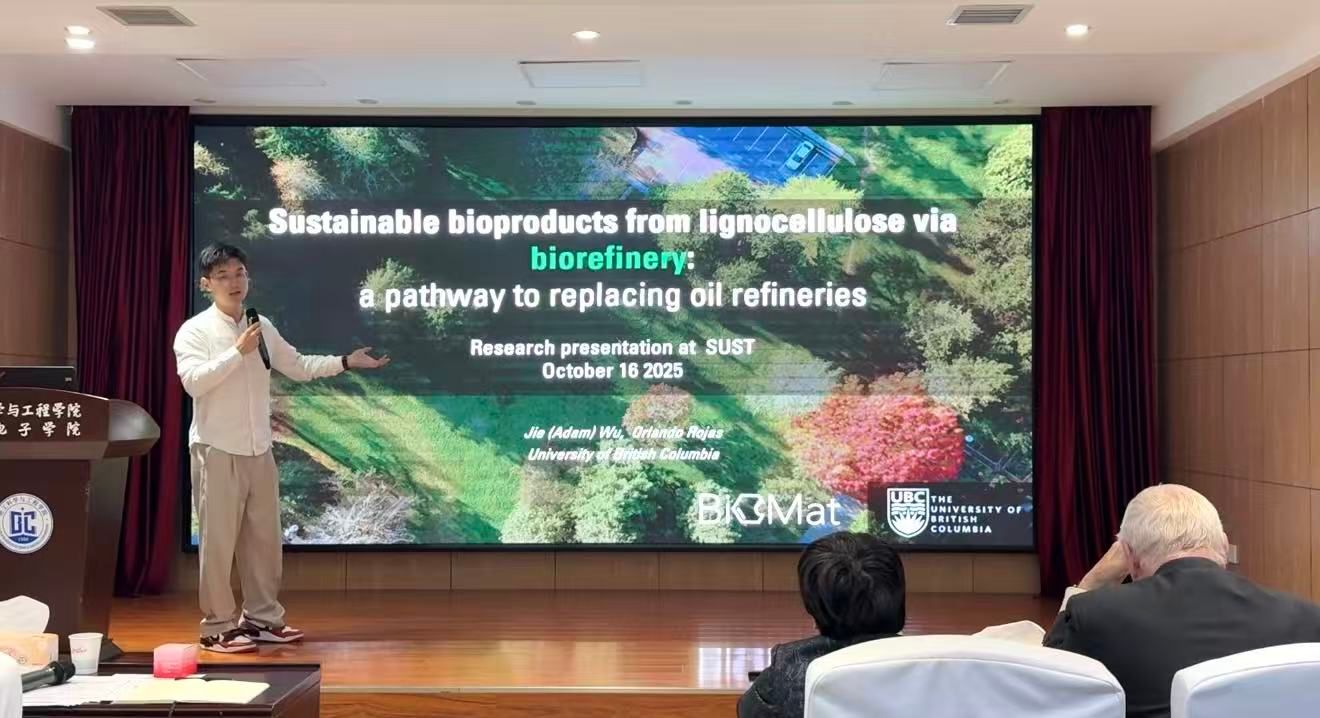 UBC畢然研究員介紹了具有定制功能的纖維素基薄膜創(chuàng)新制備策略,包括物理結(jié)構(gòu)構(gòu)建、化學(xué)改性和廢棄物再利用。展示了木質(zhì)纖維素在設(shè)計高性能、多功能材料方面的靈活性。UBC吳杰博士后介紹了通過生物煉制技術(shù)從木質(zhì)纖維素中獲取可持續(xù)生物產(chǎn)品的方法,并對生物精煉技術(shù)未來在提升轉(zhuǎn)化效率、降低成本及推動產(chǎn)業(yè)化應(yīng)用的發(fā)展展開了探討。中國科學(xué)院過程研究所盧翊研究員圍繞可再生資源高效轉(zhuǎn)化與綠色制造的前沿方向,闡述了如何利用生物質(zhì)組分膠體間非共價相互作用構(gòu)筑和利用非平衡態(tài)液液界面等。為開發(fā)兼具高效轉(zhuǎn)化率與高附加值的綠色新材料體系提供新理論方向與技術(shù)路徑。東北林業(yè)大學(xué)宦思琪教授通過利用界面工程策略,從富含羥基和復(fù)雜網(wǎng)絡(luò)結(jié)構(gòu)的纖維素和木質(zhì)素(生物聚合物)中通過液/液界面實現(xiàn)自組裝,形成乳液膠體,設(shè)計并制備出了多維功能材料??朔艘痪S材料中協(xié)同結(jié)構(gòu)-功能設(shè)計的長期難題。