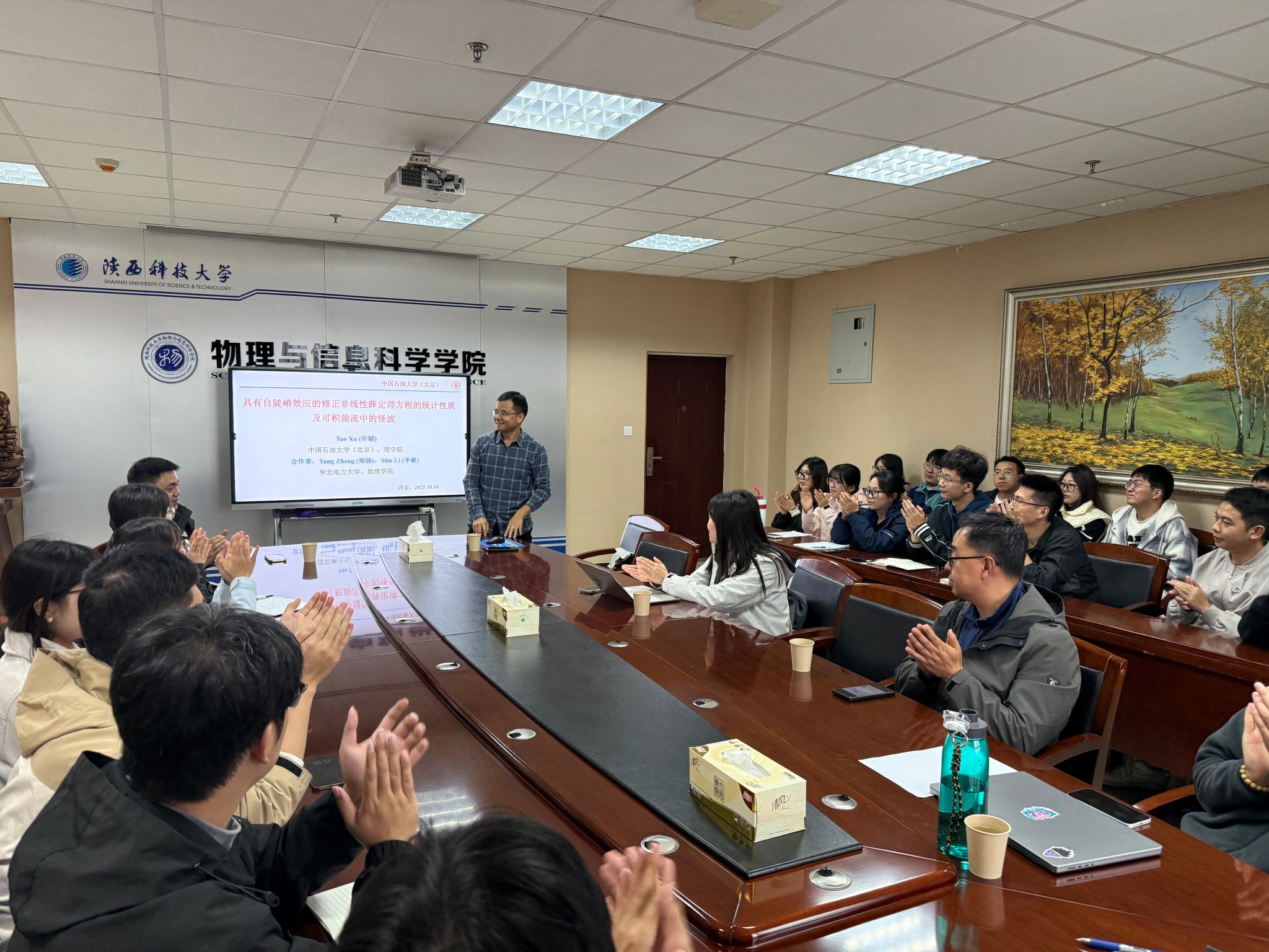 10月17日下午,應(yīng)物理學(xué)院、研究生院邀請(qǐng),中國石油大學(xué)許韜教授做客我?!拔囱雽?dǎo)師論壇”,在理科樓441做題為“具有自陡峭效應(yīng)的修正非線性薛定諤方程的統(tǒng)計(jì)性質(zhì)及可積湍流中的怪波”的學(xué)術(shù)報(bào)告。報(bào)告會(huì)由物理學(xué)院副院長張曉斐主持,量子信息系相關(guān)專業(yè)教師、研究生參加報(bào)告會(huì)。
