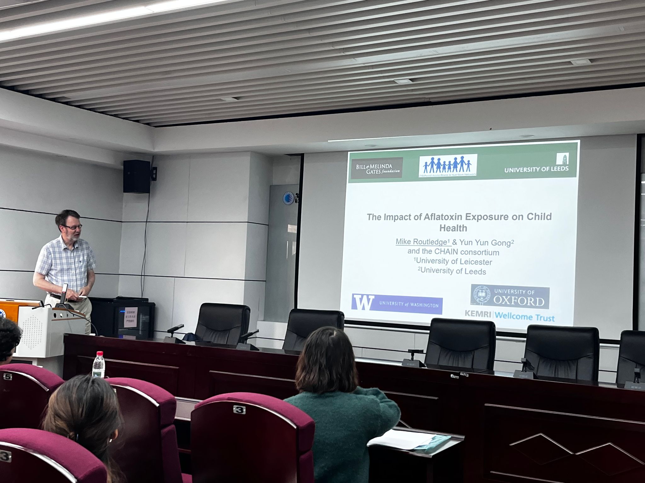 報告會上,Routledge副教授系統(tǒng)闡釋了黃曲霉毒素的健康危害機制。他首先從流行病學(xué)研究角度,通過詳實的數(shù)據(jù)和案例,分別闡述了急性和慢性黃曲霉毒素暴露對人體健康造成的不同影響。并重點介紹了當(dāng)前國際前沿的生物標(biāo)志物分析技術(shù),分享了其在非洲地區(qū)開展的大規(guī)模暴露評估研究成果。這些研究揭示了特定地區(qū)黃曲霉毒素暴露水平與嬰幼兒生長發(fā)育指標(biāo)間的關(guān)聯(lián)性,為深入理解真菌毒素對生命早期健康危害提供了重要證據(jù)。針對黃曲霉毒素的防控,Routledge副教授提出了一套涵蓋從田間到餐桌的全鏈條消減控制體系。他特別強調(diào),基于生物標(biāo)志物的精準評估是實現(xiàn)有效干預(yù)的前提,并分享了在非洲地區(qū)實施的成功防控案例。