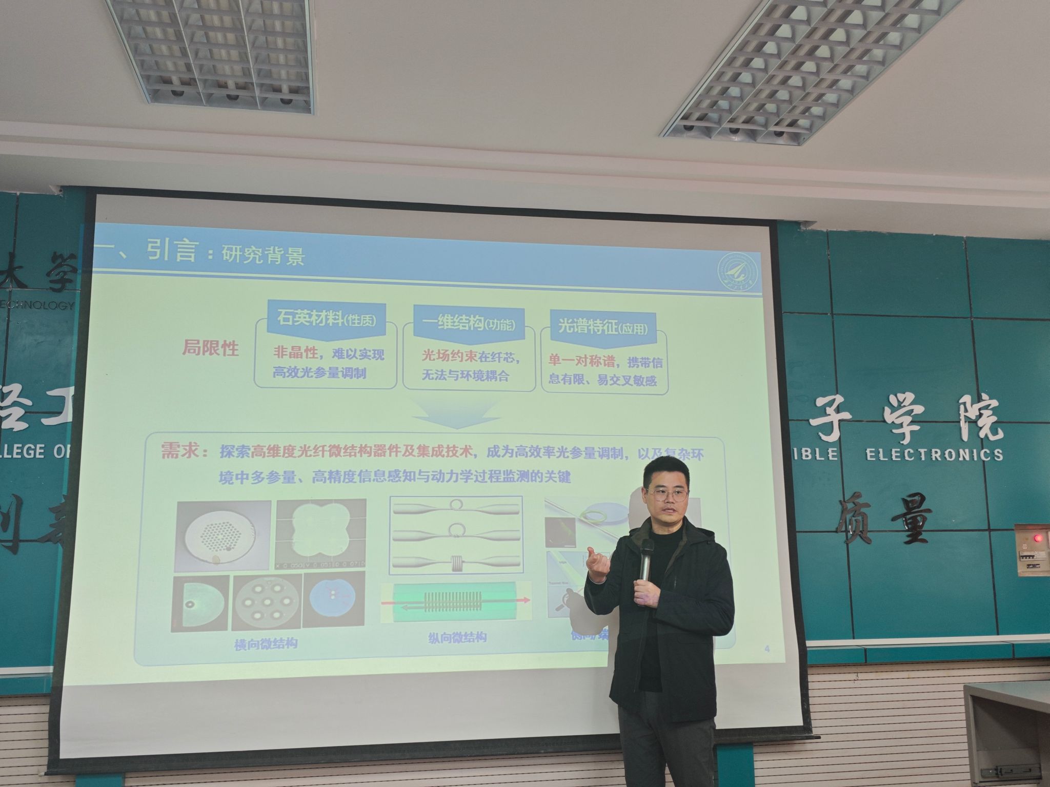 報告會上,姜碧強教授梳理了光纖微結(jié)構(gòu)集成器件發(fā)展背景與研究意義,重點闡述傾斜光纖光柵檢測的物理原理,結(jié)合生化傳感、光纖陀螺、推進劑監(jiān)測等典型場景,深入解析其傳感機制與實用價值,解決了傳統(tǒng)光纖陀螺穩(wěn)定性不足以及固體推進劑動力學過程遠程在線監(jiān)測難題,凸顯該技術在航空航天領域的獨特應用優(yōu)勢。同時,姜碧強教授詳細分享了光纖光柵傳感在固體燃料燃燒監(jiān)測中的創(chuàng)新成果——通過將傳感器嵌入燃料體系,可實時捕捉燃燒溫度分布、速率及組分變化,破解傳統(tǒng)檢測手段在高溫復雜環(huán)境下精度不足、響應滯后的痛點,為航空航天推進系統(tǒng)優(yōu)化與安全保障提供關鍵技術支撐。此外,姜教授還簡要介紹了在全光纖中實現(xiàn)二階非線性效應的突破性工作,實現(xiàn)了寬帶光的倍頻與和頻產(chǎn)生,并成功將其應用于超短脈沖測量,為超短脈沖測量開辟了新的技術途徑。