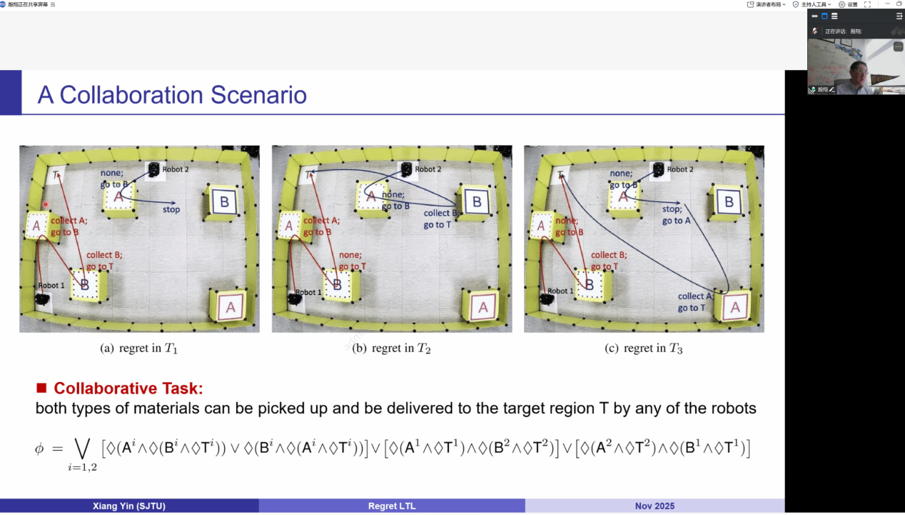 在報(bào)告會(huì)上,殷翔教授首先介紹了基于形式化方法的無(wú)人系統(tǒng)決策規(guī)劃基本概念,在此基礎(chǔ)上介紹了一種基于遺憾最小化的在線優(yōu)化與決策新框架,針對(duì)以線性時(shí)序邏輯描述有限時(shí)域復(fù)雜任務(wù),介紹了在線信息驅(qū)動(dòng)的遺憾最小控制策略,能夠?qū)崿F(xiàn)嚴(yán)格多項(xiàng)式時(shí)間的遺憾最優(yōu)策略合成,并顯著提高為任務(wù)環(huán)境的適應(yīng)性與泛化性。最后,殷教授還分享了其團(tuán)隊(duì)基于生成式任務(wù)規(guī)劃的相關(guān)最新工作,展望了該領(lǐng)域未來(lái)的一些重要發(fā)展方向。