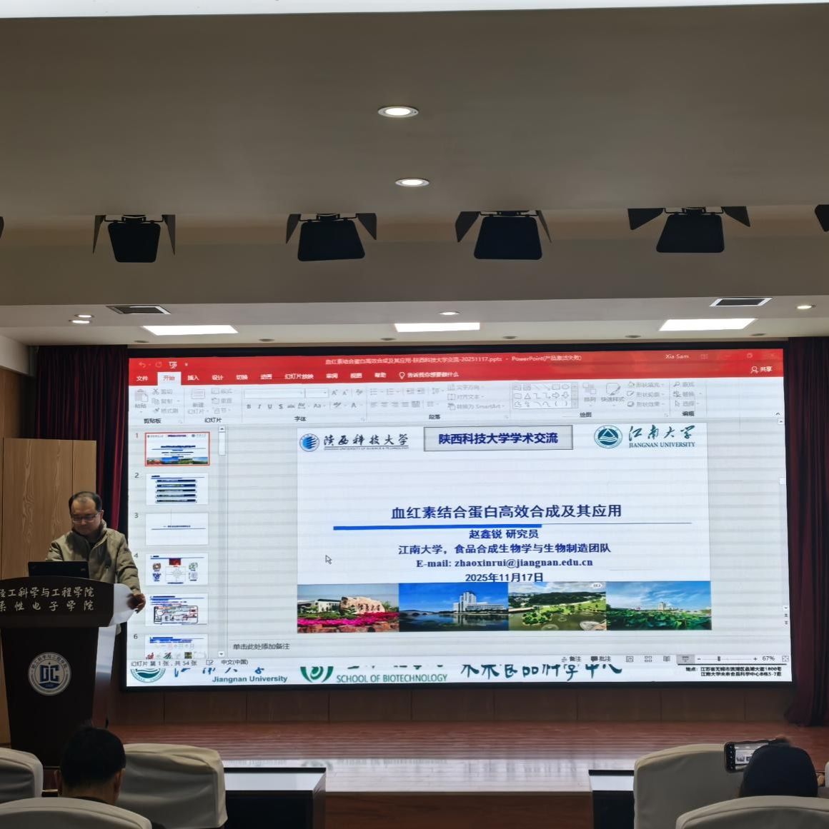 11月17日上午,受科技處、前沿院及輕工科學(xué)與工程學(xué)院(柔性電子學(xué)院)邀請(qǐng),江南大學(xué)趙鑫銳研究員做客陜西科技大學(xué)“前沿科學(xué)報(bào)告”,作了題為“血紅素結(jié)合蛋白高效合成及其應(yīng)用”的學(xué)術(shù)報(bào)告。報(bào)告會(huì)由輕工學(xué)院院長(zhǎng)呂斌主持,學(xué)院相關(guān)專(zhuān)業(yè)教師、研究生參加了此次報(bào)告會(huì)。