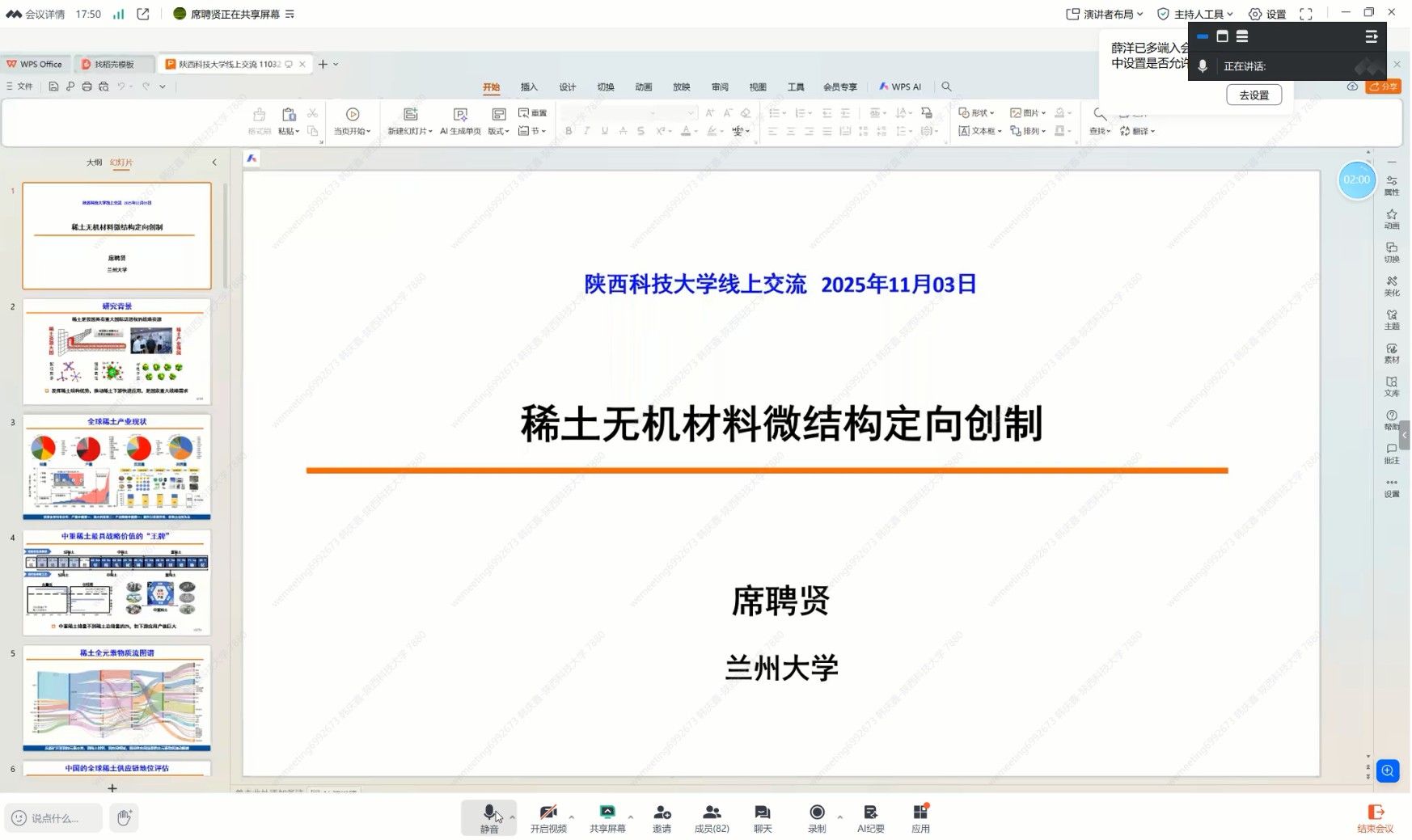 11月3日,應我??萍继?、前沿院、輕工科學與工程學院(柔性電子學院)邀請,蘭州大學席聘賢教授做客我?!扒把乜茖W報告”,作了題為“稀土無機材料微結(jié)構(gòu)定向創(chuàng)制”的學術(shù)報告。報告會由輕工學院副院長劉國棟主持,學院相關(guān)研究方向師生共同參與交流。