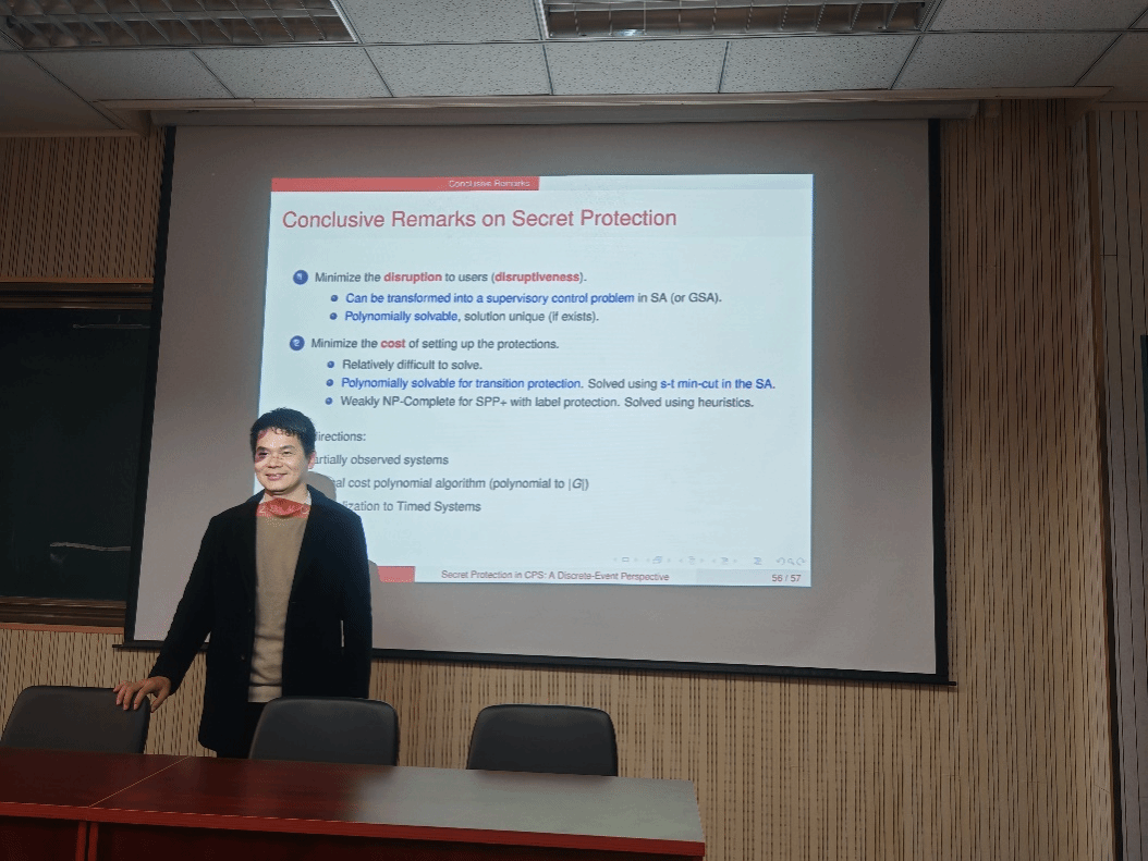 黎良副教授作了題為“基于可觀測 MSCG 的標簽時間 Petri 網(wǎng)系統(tǒng)故障診斷”的學(xué)術(shù)報告。報告結(jié)合其在時間 Petri 網(wǎng)理論與離散事件系統(tǒng)領(lǐng)域的研究成果,系統(tǒng)介紹了可觀測 MSCG 方法在復(fù)雜系統(tǒng)故障診斷中的應(yīng)用思路與技術(shù)優(yōu)勢。報告內(nèi)容理論嚴謹、邏輯清晰,為從事離散事件系統(tǒng)監(jiān)督控制、故障診斷及信息物理系統(tǒng)安全研究的師生提供了有益參考。
